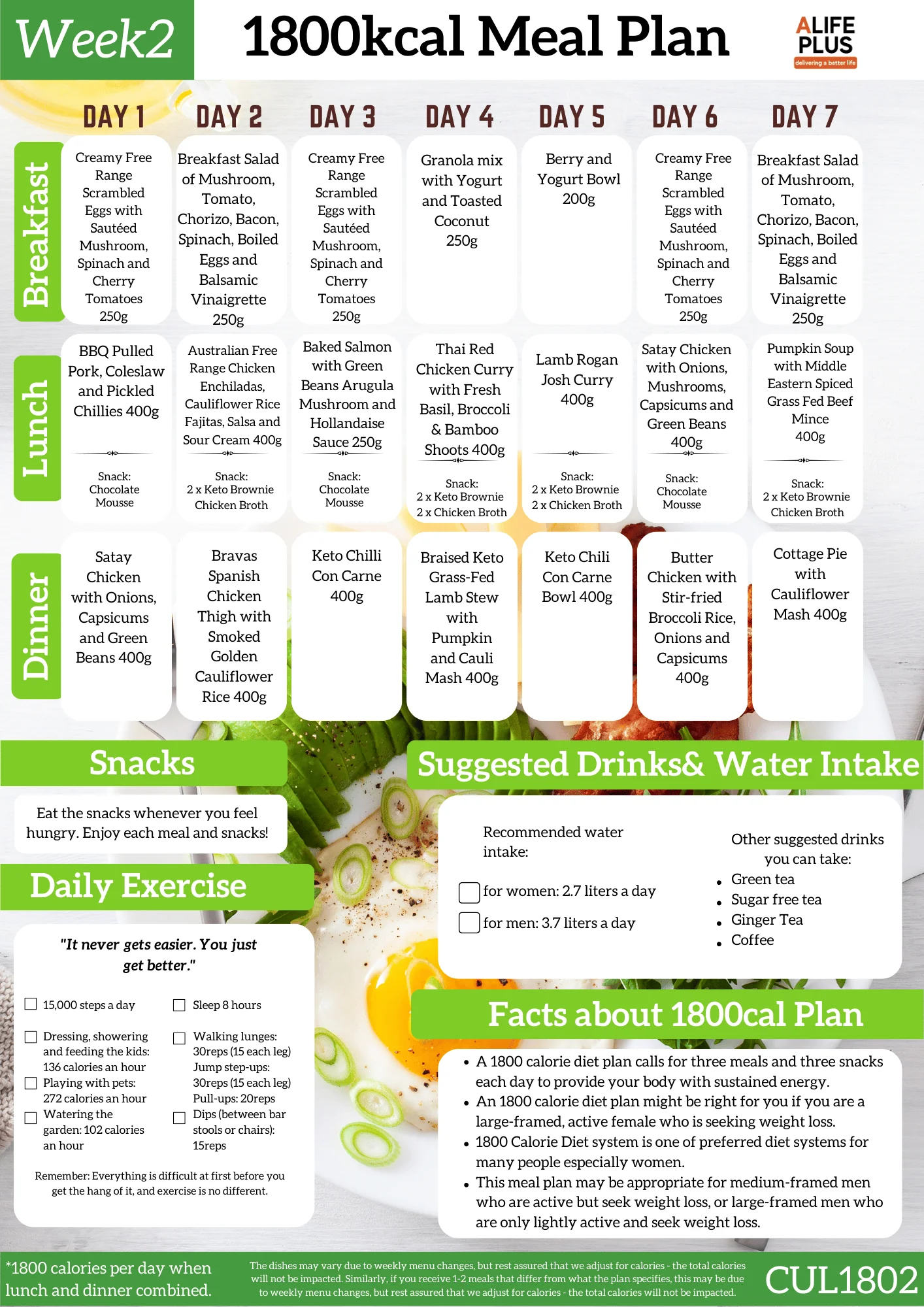 Whether you're looking to lose weight, eat healthily, and feel great, this 1,800-calorie meal plan is designed to keep you energized and satisfied. We provide you with fibre-rich foods that are also high in lean protein and healthy fats. This ensures that you have a satisfying day without going overboard on calories.